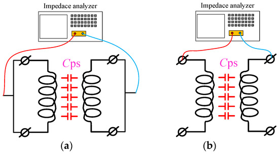 Many previous references also have discussed the issue on how to evaluate the CM noise behavior of the transformer [17,18,19,20]. Figure 5a,b depicts the traditional transformer CM characteristic evaluation method. Using impedance analyzer to measure the CM capacitance of the transformer is impractical. Because this method will not make the primary and the secondary winding build the voltage potential distribution along each winding, and this method can only measure the structure capacitance of the transformer. According to (13)–(15), it can find that the CM displacement current is both related to the structure capacitance between adjacent primary and secondary winding layers and the voltage potential distribution of the winding; merely measuring the structure capacitance cannot effectively reflect the CM displacement current characteristic of the transformer. As have discussed above, the CM noise in transformer coupling path is formed by the voltage potential distribution. Therefore this method cannot totally represent the conductive CM noise behavior of the transformer.