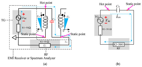 In order to take the voltage potential distribution along with the winding into consideration, reference [19], proposed using an EMI receiver (spectrum analyzer, network analyzer) with a TG option to measure the insertion loss (IL) in order to evaluate the transformer as shown in Figure 6. The positive terminal of the TG is connected to voltage hot point of the primary side and the ground terminal of TG is connected to the primary voltage static point. TG will output sinusoidal signal assigned on the primary winding, and its amplitude is 1 V. Then, the secondary winding will form the voltage potential distribution along with each turn. In this method, the transformer is regarded as a pure capacitance to conduct CM noise. The CM displacement current will flow through this equivalent CM noise capacitance and generate voltage drop in resistor R2, as shown in Figure 6b. Resistor R2 is located in the RF input terminal. Based on the definition of the insertion loss, a lumped equivalent capacitance CQ can be calculated to evaluate the CM noise characteristic of the transformer, according to (16).