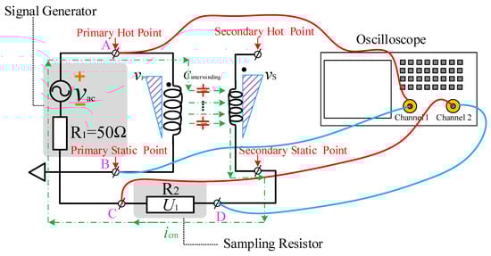Based on the above considerations, this paper proposes a practical CM noise characteristic evaluation method to achieve the same evaluation effect as discussed above. Only a signal generator and an oscilloscope can achieve the same evaluation effect in low-frequency EMI noise as shown in Figure 7. The positive terminal of the signal generator is connected to the primary voltage hot point and the ground terminal of the signal generator is connected to both primary voltage static point and one terminal of R2. The other terminal of R2 is connected to the secondary voltage static point. The secondary voltage hot point is open. In this measurement process, the CM displacement current flows through the distributed CM coupling capacitance Cinterwinding between the adjacent primary and secondary layers and generates a voltage drop in resistor R2. For transformers with different winding arrangements, the CM displacement current flowing through the transformer will be different. Then, the voltage drop measured by voltage probe in Channel 2 of the oscilloscope can reflect the size of the CM displacement current flowing through the transformer.