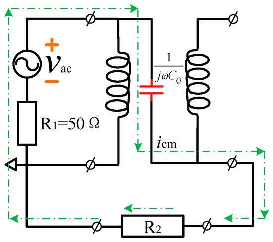 The distributed CM coupling capacitance of the transformer is represented as a lumped capacitance CQ for simplifying the analysis. Figure 8 shows the equivalent circuit of the proposed evaluation method. The CM displacement current icm flowing through the lumped equivalent capacitance CQ can be expressed as
