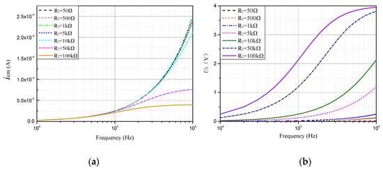 In order to represent the variation tendency of the CM displacement current icm and the voltage drop U2 in resistor R2 versus the resistance of R2, the capacitance of CQ will be assumed to be a certain value. For different value of CQ, the basic variation tendencies of icm and U2 are almost the same. In the analysis, it is assumed as 10 pF. The root mean square (RMS) of Vac is 4 V. Then, the size of the CM displacement current icm and the voltage drop U2 can be calculated under different frequencies. For general isolated SMPS, its switch frequency is from 10 kHz to 1 MHz, and a switching frequency will be chosen as signal excitation frequency to evaluate the transformer. Figure 9a,b shows the frequency-dependent curve of icm and U2. Figure 9a shows that the larger resistance of R2 will cause less displacement current icm for the same transformer. Figure 9b shows that larger resistance of R2 will cause a larger voltage drop in itself. If the resistance of R2 is equal to 50 Ω, the voltage drop in R2 will be too tiny to be precisely measured. Therefore, the resistor with 50 Ω is impractical for use in this evaluation method due to the limitation of probe accuracy. In order to acquire a larger voltage drop in R2, the effective implementation is to increase the resistance of R2 to sample the larger voltage. The voltage drop in R2 will increase if the resistance of R2 is increased. However, if the resistance of R2 is too large, it will also be unreasonable