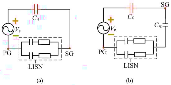 There are three lumped capacitances—CBC, CBD, and CAC—to determine the displacement current flowing through transformer coupling path. To further simplify the expression (2), CBC + CBD and CBC + CAC are defined as Cps and Csp, respectively. For flyback topology with three-wires (L, N, and GND wires), the voltage difference between the primary ground (PG) and the secondary ground (SG) can be omitted due to the small voltage drop on LISN. For flyback topology with two-wires (L and N wires), the voltage difference can also be neglected if the parasitic capacitance Csg between the secondary ground and the ground is far larger than CQ (CQ is the equivalent lumped capacitance of the transformer and it will be introduced in Section 4). The CM current flowing through the transformer can be expressed as
