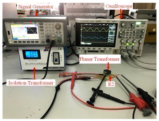 The measurement platform is shown in Figure 12, where the signal generator is Agilent 33522 A and the oscilloscope is Agilent DSO-X3024 A. The differential probe is Agilent N2790 A. As for the selection of the sampling resistor, the basic principles have been discussed in Section 4. Hence, this section will verify the significance of selecting a proper resistance of the sampling resistor. Besides, it is also important to select a suitable signal source applied in the primary winding.