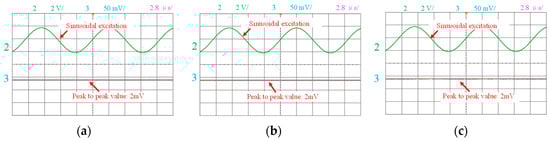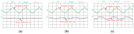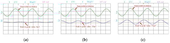 Similarly, Figure 14a–c shows the measurement voltage waveforms of the primary winding and the sampling resistor when the sinusoidal signal is assigned on two terminals of the primary winding. The sinusoidal degree of the signal source is very well compared with that shown in Figure 13. The measurement results are the same as that of using the triangular signal and the sinusoidal signal source does not distort much.