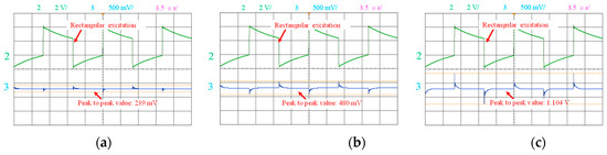 Figure 15a–c shows the measurement voltage waveforms of the primary winding and the sampling resistor when the square signal is assigned on two terminals of the primary winding. It can clearly find that the square signal has distorted severely, which cause the voltage waveform on the sampling resistor to be no longer a standard rectangular wave. There are two peaks in the rising and falling edges of the voltage in R2.