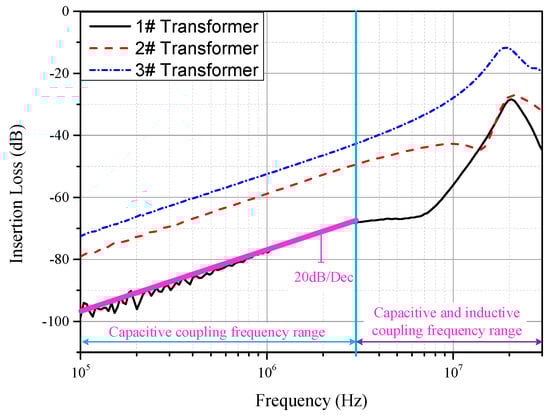 In Section 5.1, three kinds of transformers have been evaluated based on the proposed evaluation method. In this section, the following will use the previous method proposed in [18] to compare the difference between these two methods. Figure 17 shows the measurement results of the insertion loss of 1#, 2#, and 3# transformers. During the capacitive coupling frequency ranges, the transformer can be regarded as a pure capacitance to conduct CM displacement current and the slope of the insertion loss is 20 dB/Dec. For higher frequency range, the capacitive coupling and inductive coupling will make a difference to the insertion loss trace, simultaneously. For 1# transformer, its insertion loss is too small to be precisely measured in the capacitive coupling frequency range, so there is an oscillation in the low-frequency range. In order to calculate its effective capacitance, CQ, it is reasonable to regard it as a straight line in the low-frequency range. Then, using formula (11), the CQ of 1#, 2#, and 3# transformers are calculated as 0.2 pF, 1.8 pF, and 4 pF, respectively. The trend of calculation results conforms well with the evaluation results shown in Section 5.1. In order to further verify the effectiveness of the proposed transformer evaluation method, the following will measure the CM noise spectrums of three kinds of the transformers.