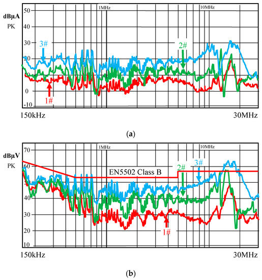 Conductive electromagnetic interference (EMI) noise spectrum. (a) CM noise spectrums. (b) Total noise spectrums.