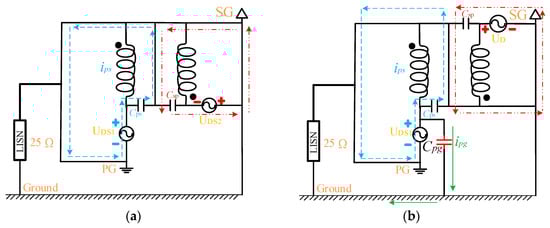 For isolated converters with three wires (L, N, and GND lines), the secondary ground is directly connected to ground. This means the voltage difference between the primary ground and the secondary ground is just the voltage drop in LISN by common-mode noise, as shown in Figure 11a, if the voltage drop of the rectifier bridge is ignored. Obviously, the voltage drop in LISN is usually very small, compared with the voltages of the primary and secondary noise sources, i.e., the voltages of primary MOSFET and secondary MOSFET. Therefore, the potential difference between the primary ground and the secondary ground can be omitted when the isolated converter has three wires. In this kind of circuit configuration, the resistance chosen for R2 should be as small as possible, and the voltage drop in R2 should be maintained so that it can be precisely measured.