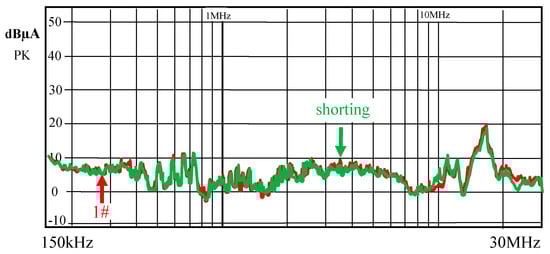 Figure 21 shows the CM noise spectrums when the static points of 1# transformer are shorted. For this situation, the CM current flowing through transformer coupling path will circulate internally instead of being detected by LISN and the measured CM noise spectrums can verify whether the transformer is well designed. It can find that the CM noise spectrum with 1# transformer is almost the same as that with shorting the static points. For this experiment result, it can prove that 1# transformer evaluated by the proposed method has a minimal peak to peak value of the voltage shown in Figure 14. Besides, it also can achieve near zero CM noise flowing through transformer coupling path.