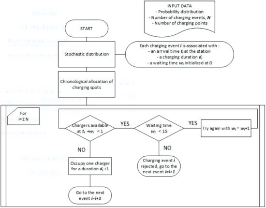 Using these metrics, we defined a minimum number of charging points able to meet the expected demand while keeping acceptable queuing levels. Allowing some queuing at the station can be considered the first measure to limit the required grid tie for a given number of charging events. The algorithm to compute the demand curve and queuing metrics is presented in Figure 2.