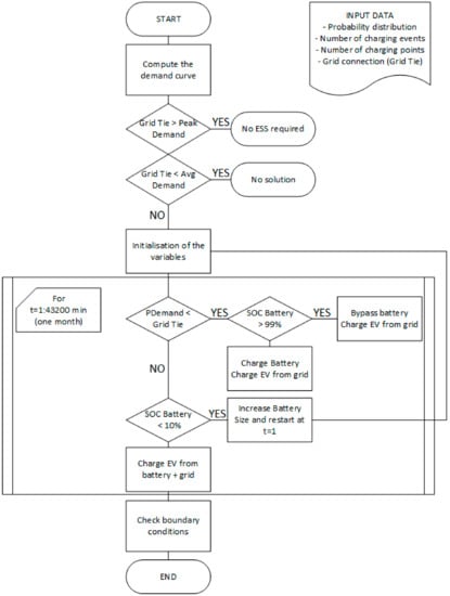 Once the number of charging events and the corresponding number of charging points was defined, the stochastic model from the previous section was used to compute the power demand curve. If the grid tie is smaller than the peak power demand but larger than the average demand, an ESS can be installed. The algorithm used to define the appropriate capacity is presented in Figure 3. The ESS capacity was iteratively increased until a full month could be covered without the SoC going below 10%. We also ensured that, at the end of the month, the battery could be returned at the same SoC as in the beginning. A charging and a discharging efficiency of 95% was considered (90% round trip). Because of the stochastic nature of the problem, 100 months were simulated in order to ensure the consistency of the results. The algorithm was stopped if the required ESS capacity exceeded 1.1 MWh.