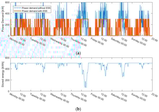 A typical mode of operation of the ESS during a week is represented in Figure 4. We can note that the ESS undergoes only a limited number of full discharge cycles, which only occur during peak hours without idle periods to recharge the ESS.
