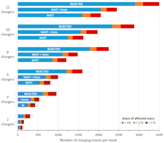 The stochastic distribution of charging events throughout the month results in some queuing. For 2 to 12 chargers and from 0 to 3500 charging events, the queuing events were accounted and are presented in Figure 5. Within the blue region, less than 1% of the users are subject to the respective queuing experience: waiting, waiting more than 5 min, or being rejected. For example, 1000 charging events per week can be provided with only 4 charging points, but with more than 5% of charging events rejected (queuing for more than 15 min). Six charging points seems to be more appropriate, with 5% of the users waiting more than 5 min and less than 1% rejected. Finally, a higher level of service is offered with 8 charging points for 1000 charging events per week, with only 2% of users needing to wait.