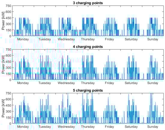 In Figure 9, we can observe the concentration of charging events when a constraint on the available charging points is introduced. With three installed charging points, the station is fully occupied for 1118 min per week (12% of the time). With four and five charging points, the station requests the full power for, respectively, 278 min and 65 min.