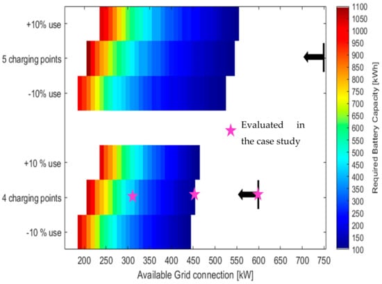 Installing four charging points instead of five can already reduce the required grid connection from 750 kW to 600 kW, and thus 15 kCHF can already be saved in initial grid connection fees, and 660–2325 CHF per month in demand charges. In order to further reduce the required grid tie, without affecting queuing time, such as with the three-stall station, an ESS can be installed. The ESS sizing algorithm presented in Figure 3 was used for 450 charging events per week and four and five charging points. The results are presented in Figure 10.