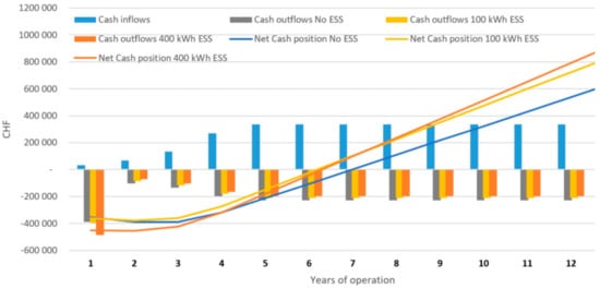 In Figure 11, we observe that, despite a larger initial investment, the 100 kWh and the 400 kWh cases are both beneficial due to the cumulative savings in demand charge. In both cases, the energy losses in the ESS represent only 0.3% and 1.1% of the total energy consumed at the station, because power is requested from the ESS only during peak periods. Without ESS, the demand charge represents 32% of the electricity expenses for the CSO compared to 26% with a 100 kWh ESS and 19% with a 400 kWh ESS.