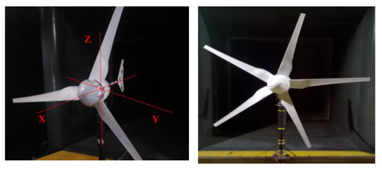 Figure 2 shows the three- and five-blade HAWT that have been used in this study. The turbine was located 1.5 m down exit convergence, and the hub height was 1.2 m from the floor of the test chamber (see Figure 3). Blades had a constant pitch angle with varying rotational speed from 100–700 RPM (see [26,27,28]). This study investigated different inlet velocities of 6, 7, and 8 m/s. During each test, the velocity was measured with and without the wind turbine rotor in the wind tunnel. The power coefficient in the wind tunnel condition was obtained from the measured data using the following relation: