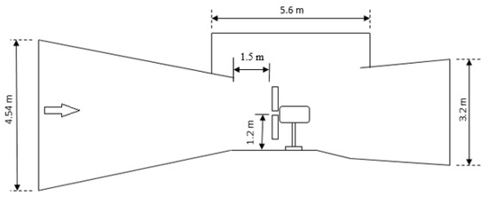 The experimental setup was designed to study the wind tunnel blockage and clearly understand the aerodynamic behavior of an horizontal axis wind turbine (HAWT). The experimental work was carried out in a closed-loop open test section of the University of Perugia (Italy). The experimental measurements were performed on a wind turbine using different numbers of blades, namely three and five, at different TSR. The rotor diameter was 2 m, and the turbine blades were jointed to a hub whose diameter was 26 cm. The blades had a constant pitch angle with varying rotational speed from 100–800 RPM, and the maximum power production was 2.8 kW. This wind tunnel was a closed-loop wind tunnel, driven by a 375-kW electric motor. The wind speed in the wind tunnel can be increased up to a maximum speed of 47 m/s. The schematic representation of this wind tunnel is shown in Figure 1.