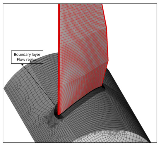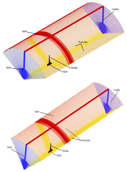 The domain was divided into 72 blocks for three- and five-blade wind turbines, and the grid was generated in each block individually. The work in [35] studied different near-wall grid spacing on the performance of National Renewable Energy Laboratory (NREL) Phase VI HAWT. They concluded that 12–20 nodes were required inside the boundary layer for safe results, and a value below 12 nodes led to inaccurate results. In addition, 100 nodes/m for chord-wise direction can be acceptable. The blocks close to the blade were generated using an O-grid to allow higher resolutions near the solid walls to solve the flow in the boundary layer near the blade, as shown in Figure 5.