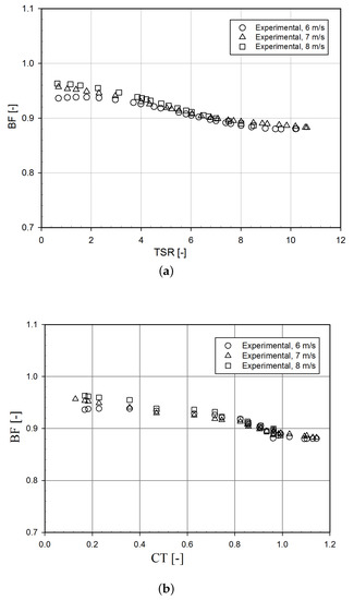 Figure 6a,b shows the relationships between experimental measurements of the tunnel blockage factor (BF) and TSR and the relationships between BF and thrust coefficient (CT), respectively, at different inlet free stream wind speeds of 6, 7, and 8 m/s, for the case of the turbine with three blades. It can be seen that the wind speed had a small effect on the blockage factor BF, as all the curves almost overlapped one another, especially at high values of TSR (or CT). For all the studied wind speeds, the blockage factor decreased with increasing the tip speed ratio, except for the lowest wind speed, i.e., 6 m/s, where the BF slightly increased up to TSR = 2 and then decreased. When TSR was larger than eight, all the BFs asymptotically became constant, reaching a lower-bounded value of approximately 0.88. This behavior was due to the fact that, while at low tip speed ratios, the mass flow rate through the rotor was quite high, at larger TSR values, the turbine blades rotated so fast as to act like a solid disc. Therefore, the thrust coefficient CT increased, and the air was more and more forced to flow around the rotor. In principle, this effect should be reduced in an open test chamber wind tunnel with respect to a closed one, but in fact, it was only reduced because some secondary recirculation vortices occurred at the corners of the test section that limited the stream tube widening (see [10]). When the wind turbine rotational speed increased, the effect of the rotation reduced the size of such large recirculations and decreased the boundary layer thickness along the walls, thus reducing the overall surface drag in the chamber, until the asymptote was reached. After this point, an equilibrium was reached between all the terms mentioned above, which was independent of the inlet wind speed.