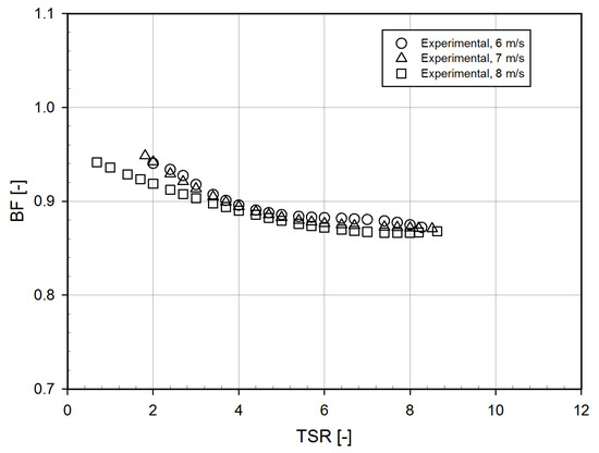 Figure 7 illustrates the experimental measurements of the tunnel BF at different inlet free stream wind speeds of 6, 7, and 8 m/s, as a function of the TSR for the HAWT with five blades. The trend of BF for the five-blade wind turbine was not completely similar to that for the case with three blades. The rotation effect described above was observed here with a stronger impact. For all cases, the blockage factor decreased with increasing the tip speed ratio, and the BFs were still very similar for different inlet wind speeds. However, the effect of rotation was stronger in the present case than in the case with three blades, which made the BF reach the asymptotic behavior approximately after TSR equal to six, instead of eight. Furthermore, the value of the asymptote was slightly lower than the three-blade case, which could be due to an increase of the swirling effects of the blade tips on the wind flow that contributed to reducing the boundary layer thickness at the walls and the recirculation vortices at the chamber’s corners.