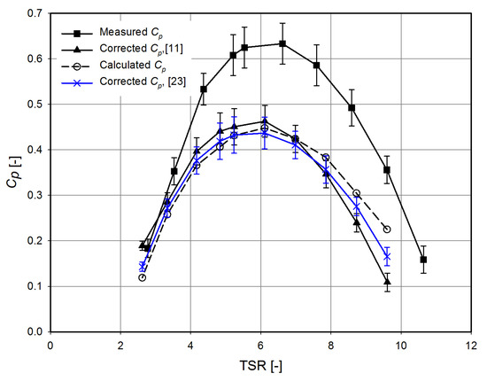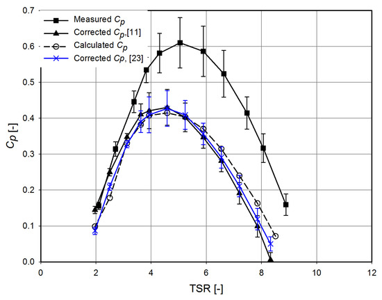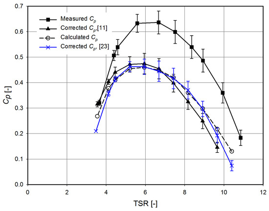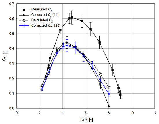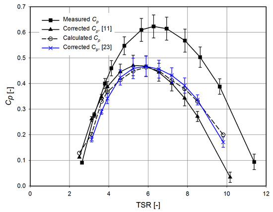 Figure 11 and Figure 12 present the measured, corrected, and calculated power coefficients at different tip speed ratios for the wind turbine with five blades. Analogously to the three-blade case, the walls’ interference led to an increase of the power coefficients, and the corrected power coefficient values were lower than the calculated ones due to mechanical losses.