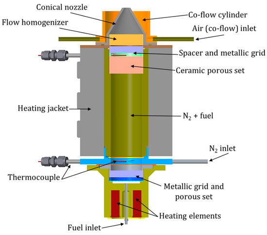 Figure 1 shows the novel burner designed. It was constituted of two main sections: The first section was a vaporization zone, 100 mm in length, where the fuel was inserted and pumped upward by a gear pump (HNPM mzr®-2921) through a 4 mm diameter tube. The tube was surrounded by five heating elements (380 °C heating temperature) which allowed for the pre-vaporization of the diesel fuel before entering into the intermediate zone. After passing through a metallic grid coupled with a metallic porous set, the vaporized fuel, 0.175 L/min gas volume flow at 380 °C (corresponding to 0.45 g/min), was inserted into the intermediate zone where it was mixed with N2. A constant volume flow of 0.3 L/min of nitrogen (at 380 °C) was used as carrier gas instead of air in order to avoid auto-ignition (as the auto-ignition temperature is in the same range as the boiling temperature) inside the mixing zone of the burner. N2 was pre-heated up to 380 °C and inserted from both sides between the vaporization zone and the mixing section; in this way, a swirling flow was generated in the mixing zone for better homogenization of the fuel–nitrogen blend. The fuel–nitrogen mixture then entered the second section, which was a mixing chamber with 180 mm total length and 45 mm inner diameter. A second ceramic porous set and a flow homogenizer, preceded by a metallic grid, were arranged at the end of the section before the flame zone. A constant temperature between 370 and 380 °C was achieved by a heating jacket which surrounded the mixing section. This temperature range was chosen for complete evaporation and, at the same time, to minimize pyrolysis (which mainly occurs between 400 and 800 °C [45]). The inner flow temperature was constantly monitored by two inner thermocouples positioned at the beginning of the modular stage and before the flame zone. The 45 mm diameter of the inlet tube, which allowed the generation of the desired homogeneous mixture of the N2–fuel blend, was subsequently decreased by a conical nozzle to 2.5 mm to stabilize the flame. The Reynolds number at the burner outlet was approximately 100. Furthermore, a co-flow of air, 18 L/min volume flow at standard temperature, and pressure was inserted in order to efficiently shield the flame. The air was pre-heated up to 380 °C and introduced from both sides around the nozzle. The co-flow cylinder was filled with glass spheres for homogenization of the air co-flow. The laminar flame obtained exhibited a height of 95 mm and a width of 8 mm.