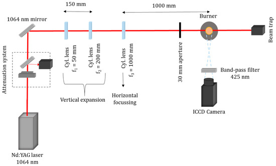 The optical LII set-up is shown in Figure 2. A Q-switched pulsed Nd:YAG laser (Quantel, Q-smart 850), with a repetition rate of 10 Hz and a pulse width of 5 ns was employed as the light source. The fundamental wavelength, 1064 nm, was chosen to avoid interferences with laser-induced fluorescence (LIF) from polycyclic aromatic hydrocarbons. The laser energy is regulated by a combination of a half-wave plate and a thin film polarizer. The beam, 6 mm in diameter, is then shaped into a laser sheet by a series of three cylindrical lenses. The first two lenses, f1 = −50 mm and f2 = 200 mm, expand the beam vertically while the last lens, f = 1000 mm, compresses the beam and focuses it into the flame. Finally, a 30 mm aperture is positioned before the burner, which cuts the edges to ensure that the final beam profile was approximately top hat. This setup generates a laser sheet of 30 mm height and 0.6 mm thickness for 2D-LII measurements. The homogeneity of the laser sheet generated was checked by using a beam profile camera (SP620U Spiricon, OPHIR Photonics). The fluence used is varied between 0.05 and 0.3 J/cm2. The detection system consists of an intensified CCD camera (Andor USB iStar model DH334T-18F-E3, 16 bit) with a resolution of 354 × 301 pixels (maximum resolution 1024 × 1024 pixels). The gate width used is 20 ns while the repetition rate is 10 Hz. A band-pass filter at 425 nm with 50 nm FWHM is employed. For the quantification of the soot volume fraction by LII, the absolute incandescence intensity was calibrated by extinction measurements using a CW laser wavelength (532 nm) on a flat flame from a McKenna burner and, subsequently, compared with the incandescence intensity measured in the diesel burner. From the ratio between the beam intensity before (I0) and after (I) the flame, and knowing the path length of the beam in the flame d, the extinction coefficient Kλ is obtained by