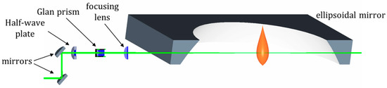 The optical set-up used to adapt the WALS technique to the burner configuration is shown in Figure 3. The ellipsoidal mirror required for WALS measurements can be described as a slice cut out of a spheroid with 32 mm height. The body of the mirror is made out of aluminum, while the reflective surface has an amorphous nickel plating. The distance between the two focal points of the mirror is ∆f = 600 mm and the diameter of the respective plane is 250 mm. Two slits of 10 mm width are placed oppositely to each other in order to allow the beam to pass through. The mirror is positioned above the burner, while the flame generated from the burner is located in the first focal point of the ellipsoidal mirror. The scattered light from the first focal point of the mirror is imaged onto the CCD-camera (AV PIKE F-100B, 1000 × 1000 pixels, 16 bit) by the mirror and a camera lens. An aperture in the second focal point of the mirror defines the size of the measurement volume in the first focal point, which is about 0.3 mm under 90° scattering angle. The exposure time of the camera for the measurements was set to 43 µs. A bandpass filter (535 nm wavelength to compensate the blueshift of the tilted illumination under 12.5°) placed before the lens blocked the ambient light and light from soot luminescence. The camera-mirror system is installed in a rotatable construction and tilted by an angle of 15°, with respect to the vertical axis of the burner, as it can be observed in Figure 4, in order to avoid the signal being completely blocked by the burner. In this manner, the scattered light is collected by one half of the mirror, which contains all the information, while the redundant signal from the other half is discarded. A cw-laser (Qioptiq Nano-250) at 532 nm wavelength, 200 mW, (35 mW used for measurements), is used as the light source. The beam is focused into the measurement volume by a f = 300 mm lens to obtain a small measurement volume with constant flame conditions. The beam polarization is cleaned by a Glan–Taylor prism and adjusted to vertical relative to the mirror plane. The optical set-up had to be calibrated to account for the 1/sin(θ) size dependence of the measurement volume as well as for aberrations caused by the mirror’s surface. For this purpose, calibration measurements on nitrogen molecules, scattering in the Rayleigh regime, were carried out. The irradiation was performed using vertically polarized light; in this manner the scattering of the gas molecules is expected to be isotropic in the scattering plane. For calibration with nitrogen, the laser-power was increased to 200 mW, while the exposure time was increased to 3 s. These settings guarantee sufficient scattering signal as well as constant conditions during a single camera exposure to avoid signal blurring.