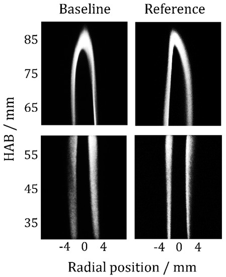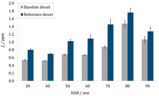 It was also observable that for both fuels soot volume fraction increased with increasing HAB, until 80 mm HAB, because of ongoing soot formation. At 90 mm, HAB soot oxidation became dominant; therefore, a reduction of volume fraction occurred. The behavior observed is consistent with data in the literature [50]. The averaged soot volume fraction measured along the width of the flame (~10 mm, from −5 mm to +5 mm) and the maximum fv for the HAB considered, expressed as ppm, are reported in Table S1 in the Supplementary Material. In the diesel flame studied, the maximum fv found was between 1.5 ppm for the baseline diesel and 1.8 ppm for the reference diesel. A more detailed comparison for the two diesel fuels is shown in Figure 10. The combustion of the reference diesel CEC RF-06-03 exhibited between 17% and 40% (depending on the HAB) more soot production with respect to the baseline diesel CEC RF-79-07, especially in the soot formation zone. The error bars, calculated from the standard deviation of the sample distribution, were always below 9%. The two fuels tested had a similar cetane number (52.4 for the reference, 53.3 for the baseline), viscosity, and density (about 2.8 mm2/s at 40 °C for the viscosity and 834 kg/m2 at 15 °C for the density for both fuels). The difference found between the two fuels can be explained by a higher content of aromatic species (mainly mono-aromatics) by about 3% in the CEC RF-06-03 reference diesel. In fact, the phenomenological models of soot formation [51,52,53] postulate that the propensity of a fuel to generate soot is determined mainly by the rate of incipient soot nucleation. The nucleation can involve several paths: Cyclization of chain molecules into rings or dehydrogenation (at low temperatures) of aromatic rings and subsequent formation of polycyclics, as well as breakup and subsequent recyclization of rings at higher temperatures. Fuels with a higher content of aromatic species are; thus, expected to show a higher potential for particle nucleation. As a consequence, also a little difference in aromatics content, like in our case, can cause a significant increase of soot emission, which arises from a growth in the number of soot nucleation paths. Overall flame temperature has a significant impact on the soot formation process. Though it may be assumed that temperatures in the flame were very similar for both fuels, and thus effects resulting from temperature were minor, we also intend to perform temperature measurements in future work.