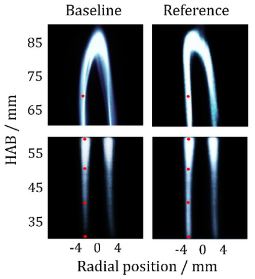 The resulting diesel flame was laminar and sufficiently stable for soot characterization studies. Nevertheless, the flame had minor fluctuations of ±0.7 mm from the central position in the radial direction. For LII measurements, 5000 images were acquired and, after a selection based on symmetry criterion, around 1000 LII images at every height were considered and evaluated to quantify the soot distribution. A background image of the flame with the laser turned off was recorded, accounting for flame luminosity, ambient light, and thermal noise of the camera. LII single-shot images of the reference and baseline diesel flame between 30 and 90 mm height above the burner surface (HAB) are shown in Figure 5, while the averaged images of 1000 LII-single-shots at the same position are shown in Figure 6. The red dots in Figure 6 indicate the location of the WALS measurements.