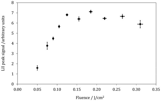 Under flame conditions for pulsed LII, the peak-LII signal typically increased by increasing the fluence until it reached a maximum. In fact, the peak-LII signal started to saturate when the sublimation temperature was reached [49]. For quantitative LII measurements, the prompt LII signal intensity was evaluated. To minimize effects of fluence fluctuations from the laser and laser extinction, first the fluence for a maximum LII signal had to be adjusted. The LII peak behavior as a function of the fluence was; therefore, determined for the diesel flame under study; Figure 7 shows the resulting LII fluence curve. The LII signal was measured at 50 mm above the burner and resulted from the average of 200 single-shot measurements for every fluence. A fluence of 0.15 J/cm2, at the beginning of the plateau region of the curve, was chosen for the subsequent quantitative measurements. At this fluence, the LII peak was barely dependent on the fluence itself, allowing for a proper evaluation of the soot volume fraction.