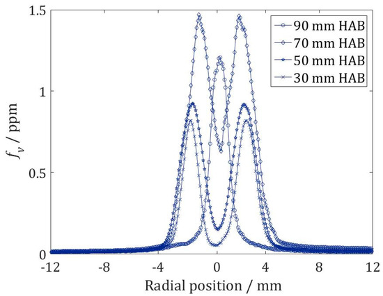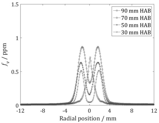 Figure 8 and Figure 9 show the radial soot volume fraction distribution estimated from the averaged LII signal intensity of 1000 single-shot images after calibration by extinction. The measurements were carried out from 30 to 90 mm HAB, in intervals of 10 mm. The overall height of the flame did not change when the fuel was changed; therefore, it was possible to compare the measurements carried out at different heights in the flame between the two fuels. In the chart only 30, 50, 70, and 90 mm were reported. For both fuels, the soot volume fraction reached its maximum in the annular region of the flame, while the central section of the flame exhibited a lower concentration or absence of soot. As expected for diffusion flames, soot was formed in the fuel-rich regions (i.e., below the stoichiometric surface in which fuel and air is perfectly mixed). Accordingly, the LII signal exhibited two peaks in the annular areas, from 30 to 80 mm HAB. The two typical peaks of diffusion flames, which were visible until 80 mm HAB, joined into one peak higher in the flame (i.e., at 90 mm), reflecting the typical “bell” trend of soot in diffusion flames.