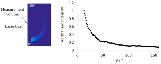 The WALS-measurement technique requires homogeneous flame-properties within the observed measurement volume, a condition not always fulfilled when the flame is flickering. From the ring-shaped scattering data from the CCD-image, scattering data with an angular resolution of 1° is generated. A total of 5000 images of the ring-shaped scattering data were collected from the point-wise measurement volume in the annular region of the flame at the same heights as LII (i.e., from 30 to 70 mm above the burner, every 10 mm; at 80 and 90 mm HAB it was not possible to collect enough data for the evaluation due to the tip fluctuation). As calibrated scattering data from fractal aggregates should monotonously decay with increasing scattering angle, data with positive slope could be discarded. A filter prevented the further evaluation of scattering data that exhibited an increase in intensity between 10° and 90°. For the backward scattering, a less rigorous criterion can be employed as predominantly forward scattering contains the data for the Rg-evaluation. Consequently, between 90° and 170° a larger number of non-decaying data-points (i.e., five) were allowed. Data that passed the filter were evaluated in the Guinier-regime according to Equation (2). Within the 5000 single-images acquired, about 200 images were selected and evaluated for every measurement point. In Figure 11 and Figure 12, one of the single images is shown (Figure 11) in comparison with the corresponding normalized intensity-angle chart. It can be observed that forward scattering is predominant over backward scattering. For the determination of effective aggregate sizes, the measured scattering data I(q) is inverted according to