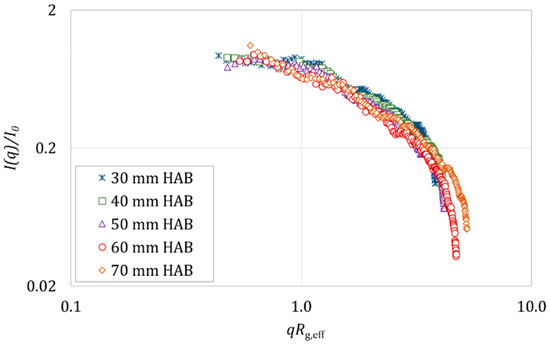 By fitting 1/I(q) against q2 within the limit of the Guinier regime (I(q)/I(0) ≤ 2), the values I(0) and the slope m are obtained and processed to calculate the value of the effective radius of gyration Rg,eff. Figure 12 displays the single-shot scattering data as a function of qRg,eff at different heights in the flame for the reference diesel RF-06-03.