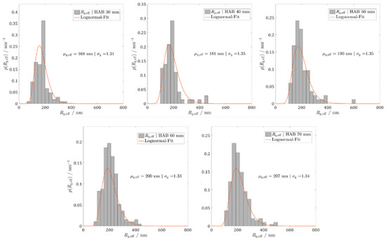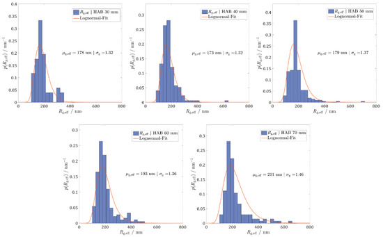 The results for the effective radii of gyration distribution from 30 to 70 mm above the burner for reference and baseline diesel are depicted in Figure 13 and Figure 14, respectively. The statistical distribution of the radii of gyration shows a lognormal shape, which was also observed in slightly turbulent flames [44]. In general, a slight increase of the median µg,eff with increasing HAB can be observed for both fuels, which can be explained by an increasing aggregation time of the particles. As for the reference diesel CECRF-06-03, the median values µg,eff obtained ranged from 178 nm at 30 mm HAB to 211 nm at 70 mm HAB. In the case of the baseline diesel CECRF-79-07, the variation of µg,eff between the lowest height at 30 mm HAB and the upper one at 70 mm HAB is approximately 40 nm.