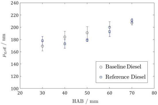 In Figure 15 the comparison of the median values µg,eff obtained at various HAB for the two fuels under study is reported. To further compare the results, arbitrary subsamples of about 200 are drawn from the full sample at each HAB, yielding a standard deviation of the µg,eff, which on average is 7 nm. Although µg seems to be slightly higher for the baseline diesel between 40 and 60 mm above the burner, within the statistical uncertainty of the results a difference in aggregate size between the two fuels cannot be stated clearly, the aggregation process itself does not seem to alter for the different fuels.