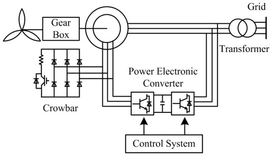 The structure of wind power system driven by the DFIG is described in Figure 1, which is composed of a wind turbine, gear box, DFIG, power electronic converter, and control system [21].