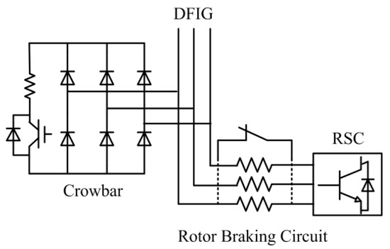 To avoid blocking the RSC and enhance the LVRT capability of the DFIG, an improved configuration of the protection circuit is proposed in Figure 3. It is composed of two sections: (1) a crowbar circuit, and (2) a series rotor braking circuit.