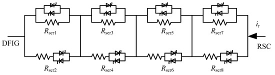 In this circumstance, to prevent the stator time constant becomes too large to affect the protection, the resistor should be optimized rather than fixed in different grid faults. As a result, a rotor braking resistor array is proposed in Figure 6. The equivalent resistance of the resistor array can be regulated through the switch. When a slight fault occurs, a low equivalent resistance is adopted so that the stator time constant cannot be enhanced too much.