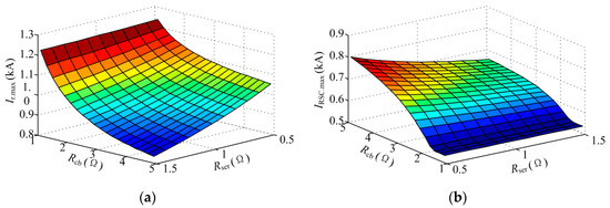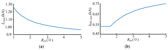 Taking a steady rotor current and the steady rotor voltage as the initial value of the numerical calculation, the rotor current and the RSC current is obtained through solving Equation (23). The calculation results are shown in Figure 9 and Figure 10, which shows the variation of maximum transient rotor current under different protection parameters. With the increasing of Rcb and Rser, rotor current in Figure 9a and Figure 10a decreases obviously. This proves the effectiveness of the proposed protection. However, in Figure 9b and Figure 10b, the RSC current increases with the increasing of Rcb. If a safety threshold of the rotor current is set, the protection parameters are determined in Figure 9 and Figure 10.