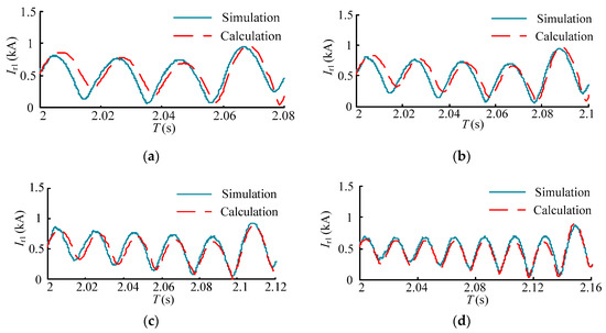 Comparison between calculation and simulation. (a) Voltage sag of 0.5; (b) voltage sag of 0.6; (c) voltage sag of 0.7; and (d) voltage sag of 0.8.
