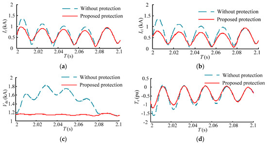 Response of proposed protection under a voltage sag of 0.6. (a) Rotor current; (b) RSC current; (c) DC-link bus voltage; and (d) electromagnetic torque.