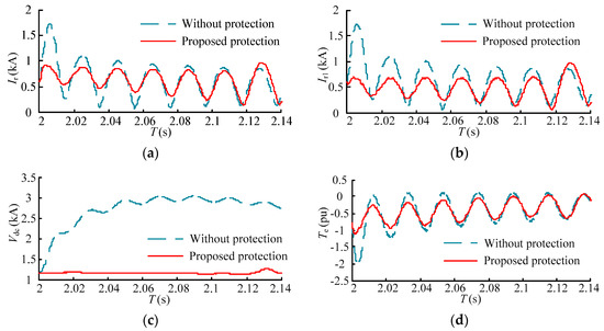 The performances of the proposed protection with the corresponding self-adaptive control strategy under different voltage sags are shown in Figure 14 and Figure 15. The transient responses without any protection are also shown. The resistance of rotor braking circuit changes gradually every 0.2 s and the protection exits at 2.08 s and 2.14 s. The DC-link overvoltage and rotor overcurrent are surely threatening the security of DC-link bus and RSC without any protection. In the proposed protection, the overcurrent and overvoltage are restrained effectively. The impact of electromagnetic torque is also restrained. Moreover, the RSC avoids being blocked and the value of the RSC current is below 0.8 kA, which guarantees the IGBTs are not be damaged and the RSC operates normally. The ripples of the RSC current and rotor current are also restrained with the proposed protection.