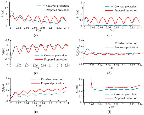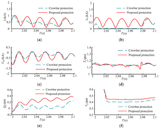 When the proposed protection is adopted, the rotor overcurrent and DC-link bus overvoltage are also avoided. Moreover, the reactive power control ability of the DFIG is retained during the protection operation. As a result, the rotor current is larger than that under crowbar protection. In Figure 16e,f below, the DFIG generates 0.3 pu of reactive power to the grid and the terminal voltage is enhanced 0.05 pu. This cannot be ignored if each DFIG of a large-scale wind farm generates reactive power.