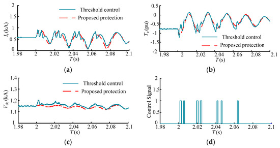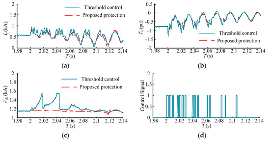 Comparisons between proposed protection and threshold control under a voltage sag of 0.8. (a) Rotor current; (b) electromagnetic torque; (c) DC-link bus voltage; and (d) the control signal of rotor braking resistor.