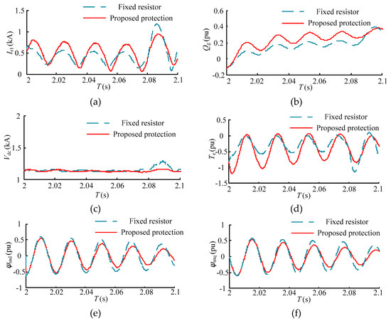 The comparison of the performance between proposed protection and the fixed rotor braking resistor is shown in Figure 20. A fixed resistor can restrain the rotor overcurrent, DC-link bus overvoltage, and the impact of electromagnetic torque more effectively. However, The RSC current is restrained excessively under a fixed resistor and, hence, the reactive power is lower than that under the proposed method. The stator transient flux linkage damps slowly due to the fixed resistor. As a result, the rotor current exceeds the safety threshold and the DC-link bus voltage is enhanced after the fixed rotor braking resistor, exiting at 2.08 s. The proposed protection control the switch of the resistor array and the equivalent resistance decreases gradually, which ensures that the rotor current is maintained at the appropriate value and the stator transient flux linkage damps quickly. Moreover, the crowbar also decreases the stator time constant and further accelerates the damping of the stator time constant. Therefore, the rotor current cannot exceed the safety threshold after 2.08 s.