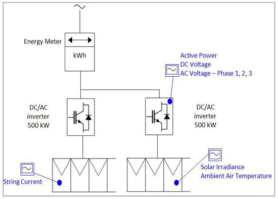 Measurements were recorded every 5 min and included AC and DC electrical parameters, AC power output, ambient temperature and solar irradiance. The monitoring system is shown in Figure 1. In particular, solar radiation on the plane of the modules and ambient temperature have been measured by a pyranometer and a PT-100 RTD sensor respectively, both installed on a sensor box near the panels. Both inverters are equipped with resistive potential divider voltage sensors for DC and AC parameters measurement for each conversion block. Shunt resistors have been used to measure 12 string currents as a representative sample of the plant.