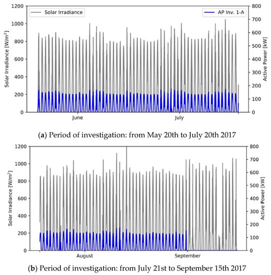 Looking at the monitored data on 31st August (Figure 3b and Figure 4b), it is possible to infer that the PV plant operates under cloudy weather conditions with variations of solar irradiance. In particular, while the inverter 2 (Figure 3b) appears to work in standard conditions, following the solar radiation trend, inverter 1 (Figure 4b) starting from 13:30 features the collapse of active power on block A, which then extends to 1st September (see Figure 4c) and gives evidence of fault occurrence.