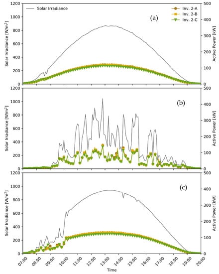 Analysis of sensor signals of the Inverter 2 on 30st August (a), on 31th August (b) and on 1st September (c)—Solar Irradiance over the Active Power of the inverter blocks.